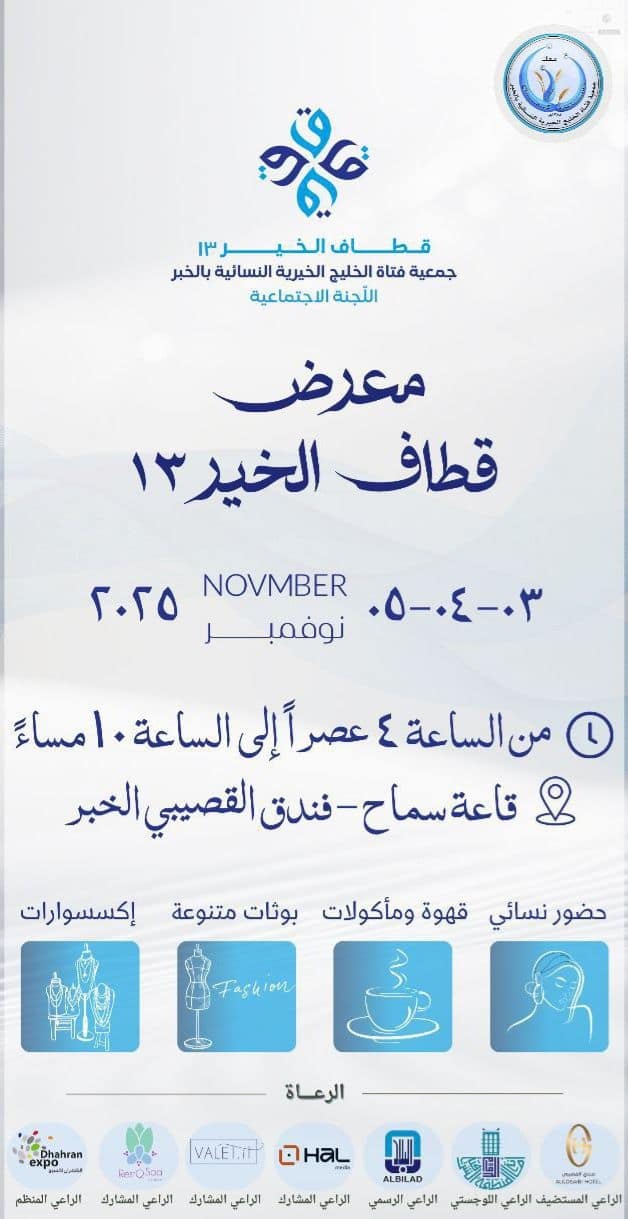 برعاية كريمة من صاحبة السمو الأميرة عبير بنت فيصل بن تركي آل سعود، تطلق اللّجنة الاجتماعية بجمعية فتاة الخليج الخيرية النسائية بالخبر، معرض قِطاف الخير (13)، وذلك يوم الاثنين 3 نوفمبر 2025م الموافق 12 جمادى الأولى 1447هـ، يستمر ثلاثة أيام، وذلك في قاعة سماح بفندق القصيبي بالخبر، من الساعة الرابعة عصرًا وحتى الحادية عشر مساءً.