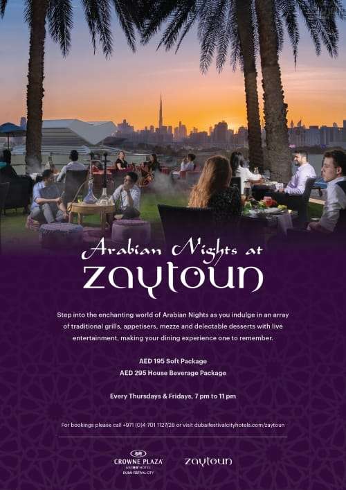 تُقام «الليالي العربية» في مطعم زيتون بفندق كراون بلازا دبي فستيفال سيتي مساء كل خميس وجمعة طوال موسم الشتاء، من الساعة السابعة حتى الحادية عشرة ليلاً. وتبدأ الأسعار من 195 درهماً للشخص الواحد تشمل المشروبات الغازية، و295 درهماً للشخص مع المشروبات الفاخرة، بينما يبلغ السعر 98 درهماً للأطفال بين 6 و12 عاماً، ويُرحَّب بالأطفال دون الخامسة مجاناً.