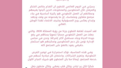 الحمد لله رب العالمين، والصلاة والسلام على أشرف الأنبياء والمرسلين. يسرّني في اليوم العالمي للتطوع أن أتقدّم بخالص الشكر والعرفان…
