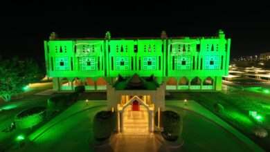 مبنى إمارة منطقة تبوك يتزين باللون الأخضر وراية التوحيد احتفاءً بيوم العلم
