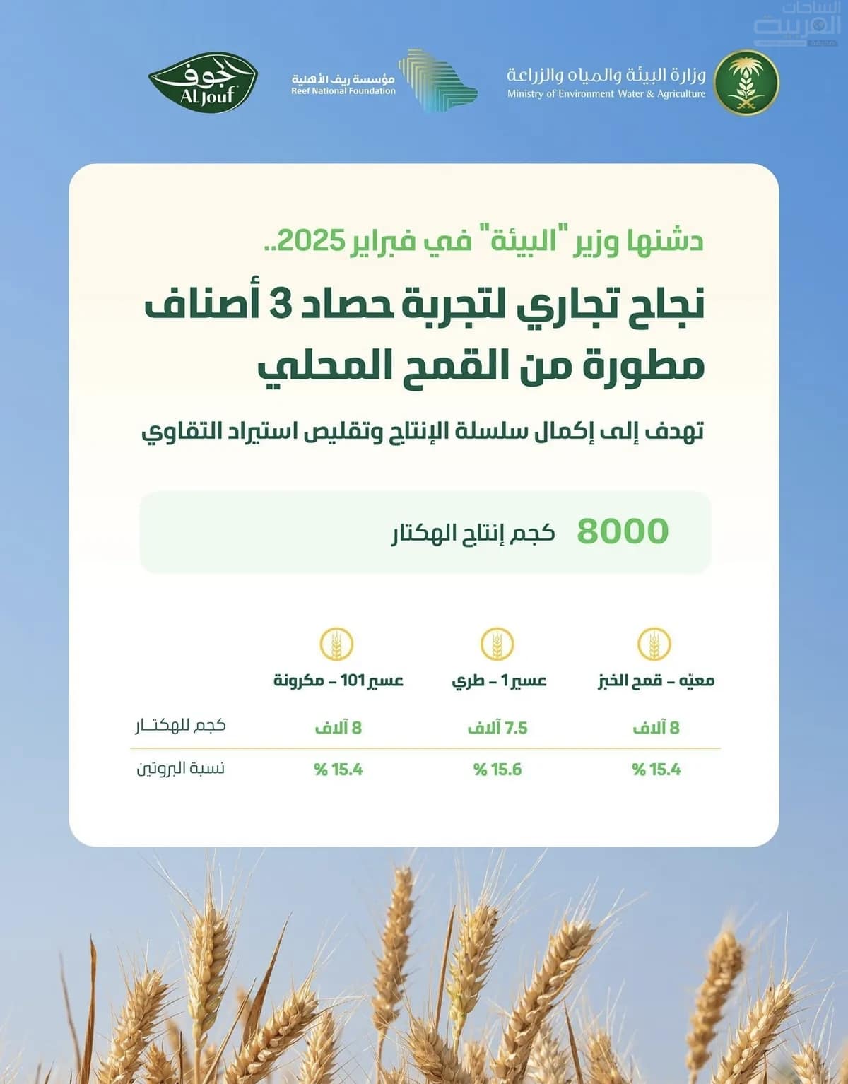 وأوضحت الوزارة، أن تجربة زراعة القمح المحلي التي استمرّت كتجارب علمية حوالي ثلاثة مواسم شملت ثلاثة أصناف مطورة؛ صنفين من القمح “الطري”، وصنفًا من القمح القاسي المعروف بـ “الديورم”، وتمت زراعة الأصناف الثلاثة على مساحة تجاوزت (45) هكتارًا في منطقة الجوف بشركة الجوف للتنمية الزراعية، باستخدام تقنيات زراعية، بالتعاون والتنسيق مع مؤسسة ريف الأهلية بمتابعة من مركز البذور والتقاوي.
