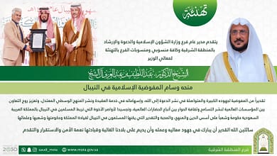 مدير فرع وزارة الشؤون الإسلامية في المنطقة الشرقية يهنئ معالي الوزير بحصوله على وسام تقديري من المفوضية الإسلامية في النيبال